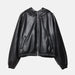 Designed in a loose, oversized fit, this womens leather jacket with hood has a zipper closure and added lace detail at the neck. It works well as a womens hooded black jacket for decent looks.